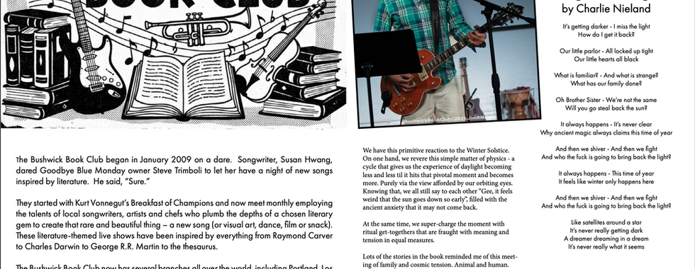 The zine features Jim's gorgeous photos of the night, lyrics of all the songs and background on all the performers. You get the back story on songwriters' processes and other inside notes on the origin stories of these brand new creative offerings for our first ever Winter Solstice Bushwick Book Club.